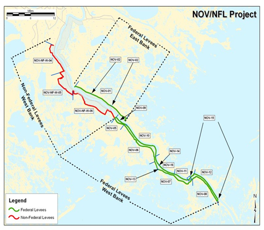 On the west bank, where the Federally-authorized West Bank and Vicinity, Louisiana Project ends in Oakville, there are levees extending southward that were previously constructed by Plaquemines Parish and private entities. The levees extend southward from Oakville to St. Jude. In the aftermath of the 2005 hurricane season, Congress authorized funding to replace and modify certain portions of the NFL, and to incorporate these levees into the NOV, LA project. The current NFL incorporated into the NOV, LA project includes approximately 34 miles of levee replacements or modifications and a tie-in to NOV levees at St. Jude. Due to available funding limitations and constraints, a risk assessment was conducted in 2013 and updated in 2015 to optimize the levee heights and minimize the consequences based on the risk analysis results. The Oakville to LaReussite levee will be constructed using the design criteria to provide a 50-Year Level of Risk Reduction (LORR). For the remaining NFL extending from LaReussite to St. Jude, designs will be optimized to a consistent/ prioritized 20-25 year LORR. Improvements along the existing NFL include levee and floodwalls, drainage structures, two pump stations, floodgates, armoring, as well as fronting protection at existing pumping stations.